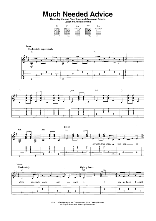 Digital Sheet Music for Much Needed Advice - from COCO by Michael Giacchino, Germaine Franco, Adrian Molina scored for Easy Guitar Tab/Vocal; id:466193