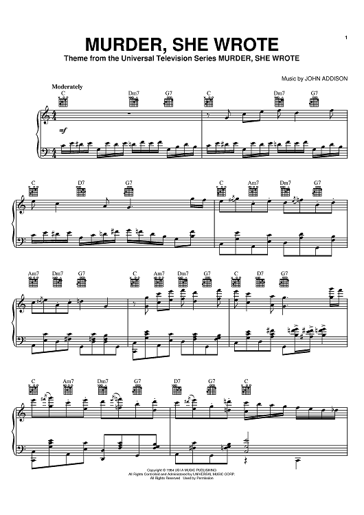 Digital Sheet Music for Murder, She Wrote by John Addison scored for Piano; id:382747