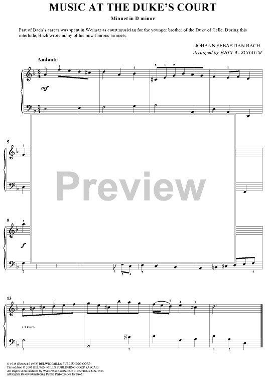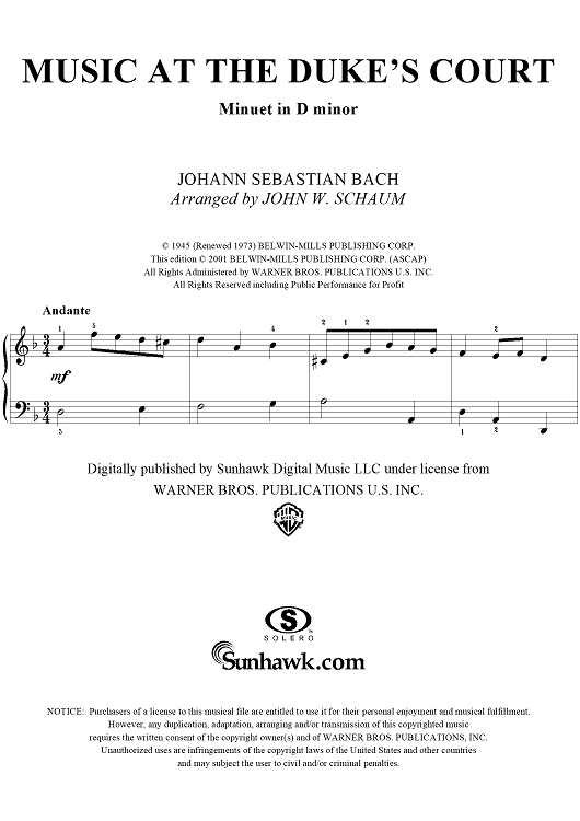 Digital Sheet Music for Music at the Duke's Court (Minuet in D minor) by John W. Schaum, Johann Sebastian Bach scored for Piano Solo; id:293076