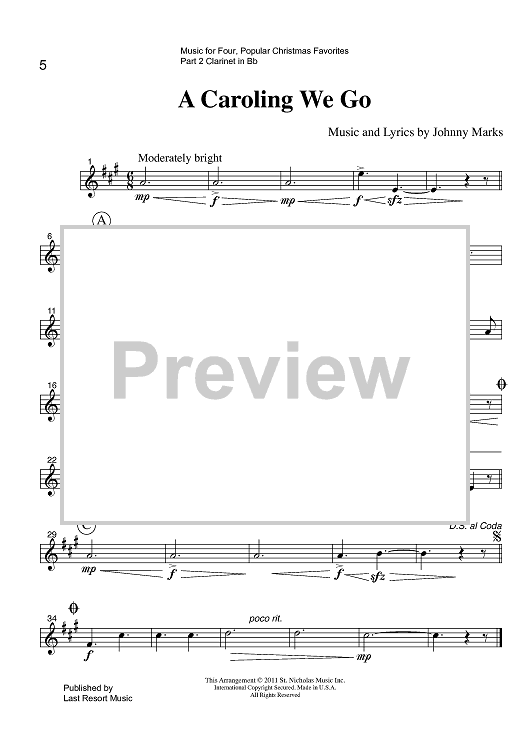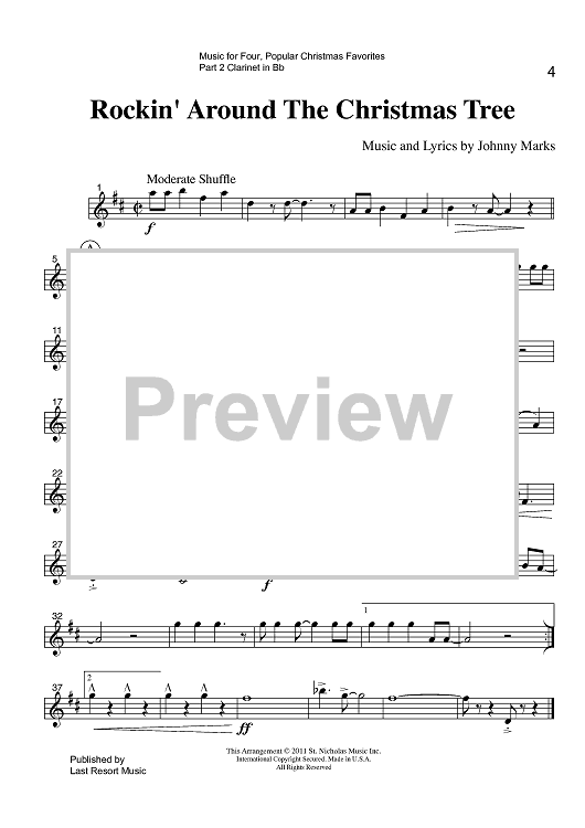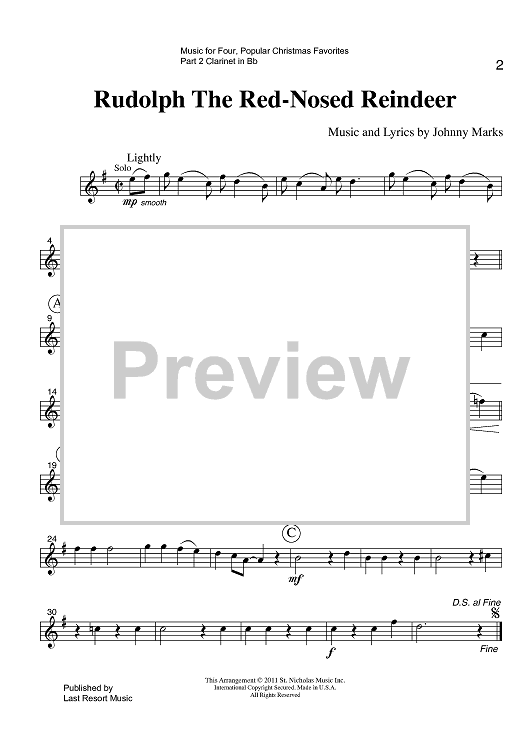 Digital Sheet Music for Music for Four, Collection No. 1 - Popular Christmas Favorites - Part 2 Clarinet in Bb by Johnny Marks, Daniel Kelley scored for Instrumental Quartet; id:421204