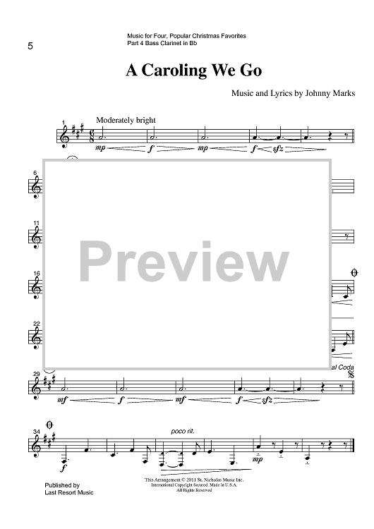 "Music for Four, Collection No. 1 - Popular Christmas Favorites - Part 4 Bass Clarinet in Bb" Sheet Music by Johnny Marks