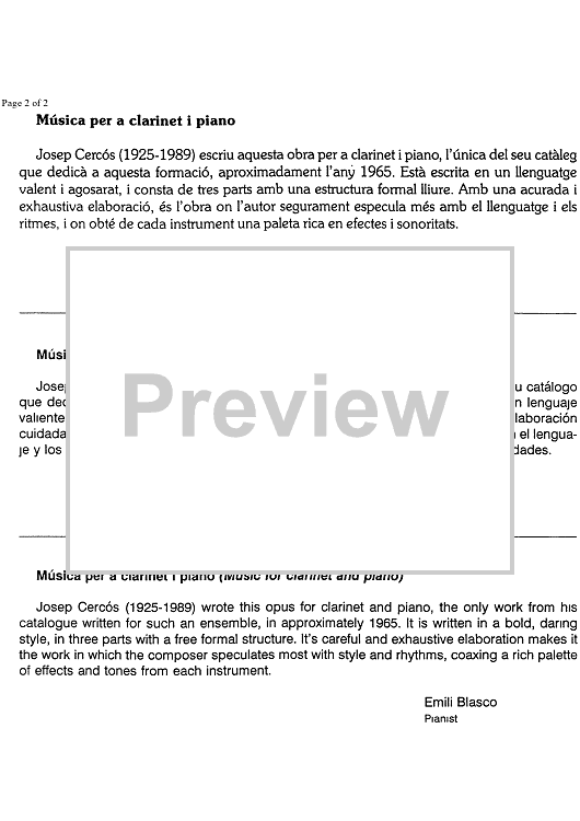 "Música per a Clarinet i Piano - Preface" Sheet Music by Josep Cercós