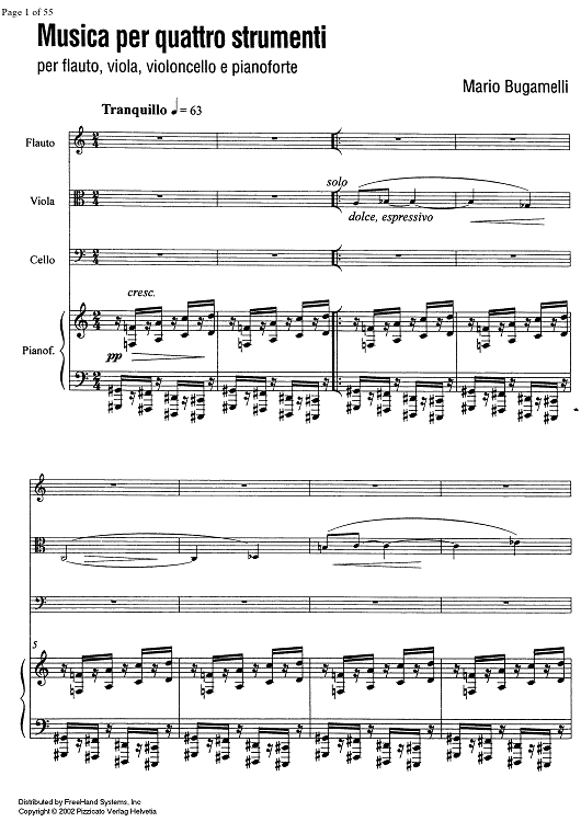 Digital Sheet Music for Musica per quattro strumenti - Score and Parts by , Mario Bugamelli scored for Flute/Viola/Cello/Piano; id:343415