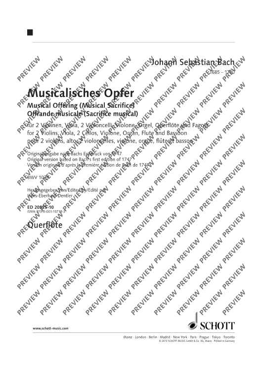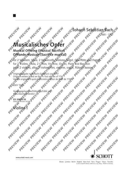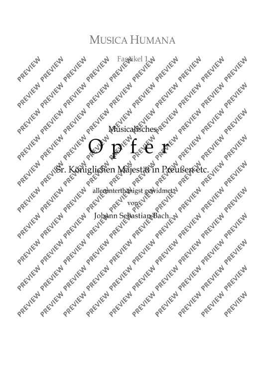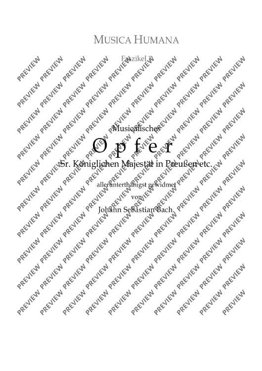 The reason for the composition of this work is well-known: Bach's encounter with Frederick the Great and the story of the 'royal theme' which the King of Prussia 'deigned to play' on a pianoforte and which Bach 'was to execute in a fugue'. The sequence of the individual movements of the composition, however, has been uncertain up to now. After an extensive theoretical examination of this problem in his book 'Johann Sebastian Bachs Musicalisches Opfer', the editor now presents his results in the form of a sheet music edition.