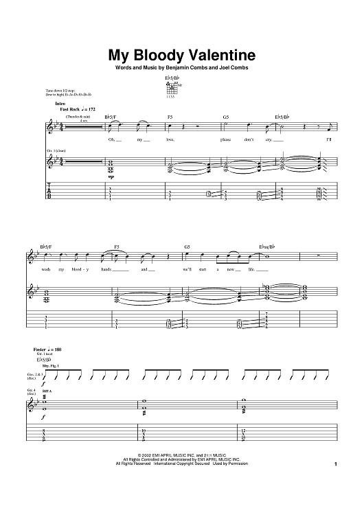 Digital Sheet Music for My Bloody Valentine by Benji Madden, Joel Madden, Good Charlotte scored for Guitar Tab; id:371015
