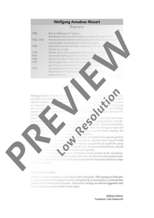 Even Mozart had to learn how to play the piano. This collection of easy works includes pieces composed by both young Mozart and by his father, for his piano lessons. Including pieces from the volume Notebook for Wolfgang alongside popular pieces by Mozart such as Ah vous dirai-je Maman (variations) and themes from Sonata in A major KV 331 and Sonata in C major KV 545. All pieces can be played with or without pedal.