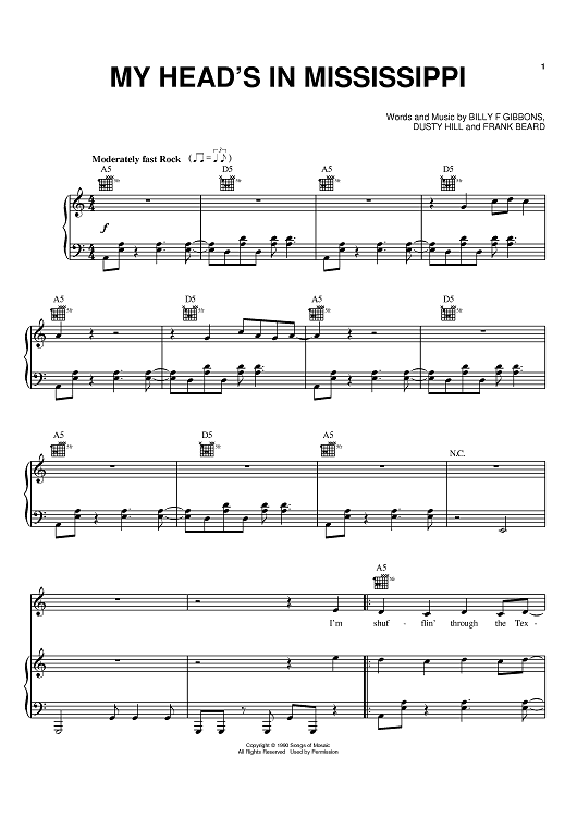 Digital Sheet Music for My Head's In Mississippi by Billy Gibbons, Dusty Hill, Frank Beard, ZZ Top scored for Piano/Vocal/Chords; id:371046