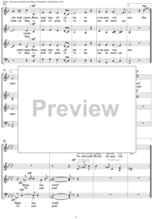 Digital Sheet Music for My Land. 2. Watchman’s Song by Edvard Grieg, E. Leonov, M. Sadovsky scored for SATB; id:366770