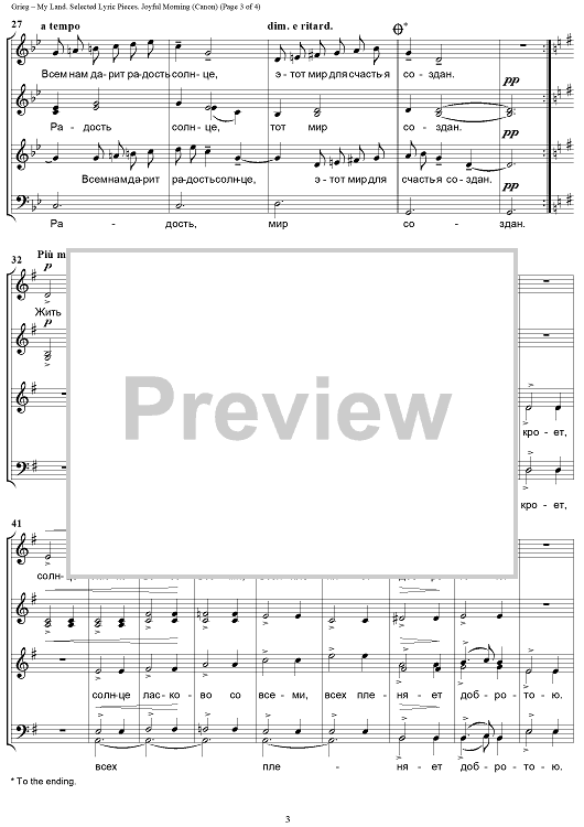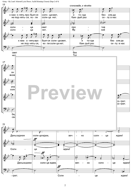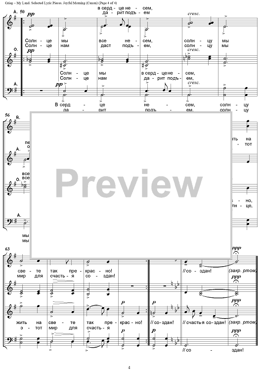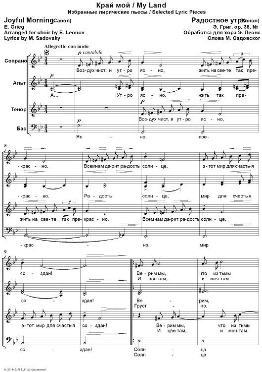 Digital Sheet Music for My Land. 8. Joyful Morning (Canon) by Edvard Grieg, E. Leonov, M. Sadovsky scored for SATB; id:366779
