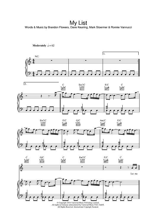Digital Sheet Music for My List by Brandon Flowers, Dave Keuning, The Killers, Mark Stoermer, Ronnie Vannucci Jr. scored for Piano/Vocal/Chords; id:401304