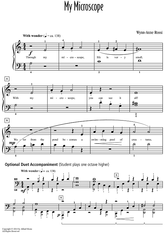This elementary piece in 4/4 meter frequently alternates phrases of staccato and legato. The modal tonality is enhanced through multiple accidentals that serve as an excellent study in reading sharps and naturals. The steps, skips, varied dynamics, and adventure-like modal sound help the music portray the foreign world of teeny creatures and objects observed through a microscope. An optional duet accompaniment provides a solid harmonic foundation.