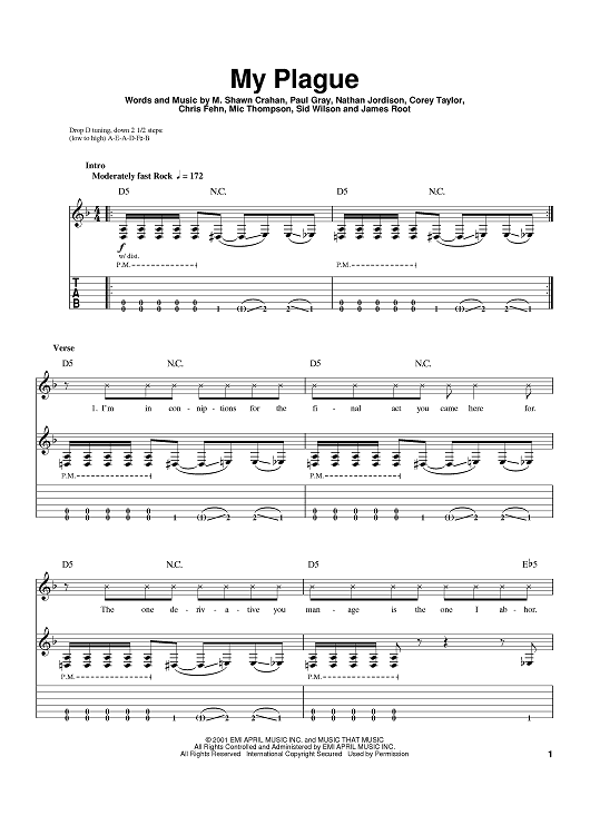 Digital Sheet Music for My Plague by Shawn Crahan, Chris Fehn, Paul Gray, Joey Jordison, James Root, Slipknot, Corey Taylor, Mic Thompson, Sid Wilson scored for Guitar Tab; id:391293