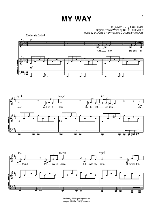 Digital Sheet Music for My Way by Frank Sinatra, Elvis Presley, Jacques Revaux, Gilles Thibault, Claude Francois, Paul Anka scored for Piano/Vocal/Chords; id:390418