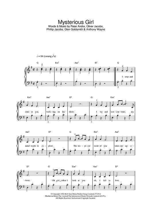 Digital Sheet Music for Mysterious Girl by Peter André, Glen Goldsmith, Oliver Jacobs, Phillip Jacobs, Anthony Wayne scored for Piano/Vocal/Chords; id:396996