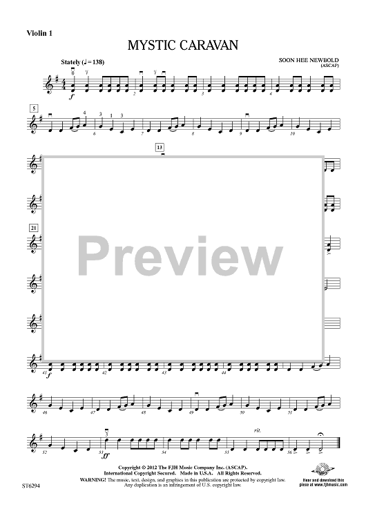 Digital Sheet Music for Mystic Caravan - Violin 1 by Soon Hee Newbold scored for String Orchestra; id:432180