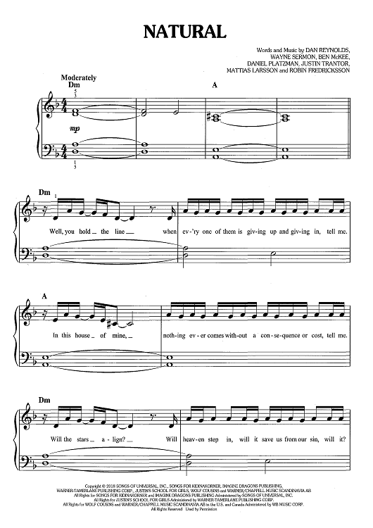 Digital Sheet Music for Natural by Daniel Reynolds, Benjamin McKee, Imagine Dragons, Daniel Platzman, Wayne Sermon, Justin Tranter, Robin Fredriksson, Mattias Larsson scored for Easy Piano/Vocal/Chords; id:467714