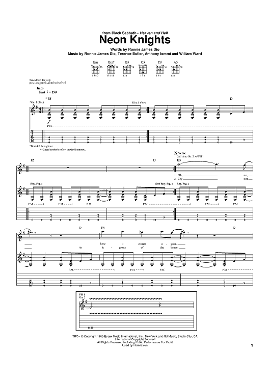 Digital Sheet Music for Neon Knights by Bill Ward, Black Sabbath, Geezer Butler, Dio, Ronnie James Dio, Tony Iommi scored for Guitar Tab; id:402399