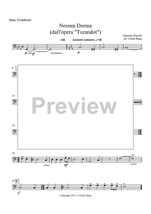 Digital Sheet Music for Nessun Dorma - Bass Trombone by , Giacomo Puccini, Ulrich Bang scored for Brass Ensemble; id:419913