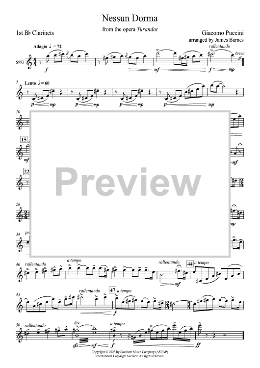 "Nessun Dorma from the Opera Turandot - Bb Clarinet 1" Sheet Music by Giacomo Puccini