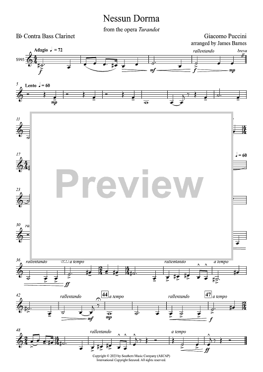 Digital Sheet Music for Nessun Dorma from the Opera Turandot - Bb Contra Bass Clarinet by Giacomo Puccini, James Barnes scored for Concert Band; id:503133