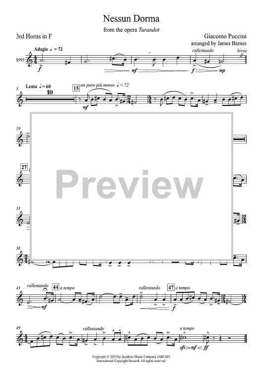 Digital Sheet Music for Nessun Dorma from the Opera Turandot - F Horn 3 by Giacomo Puccini, James Barnes scored for Concert Band; id:503143