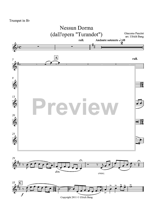 Digital Sheet Music for Nessun Dorma - Trumpet in Bb by , Giacomo Puccini, Ulrich Bang scored for Brass Ensemble; id:419907