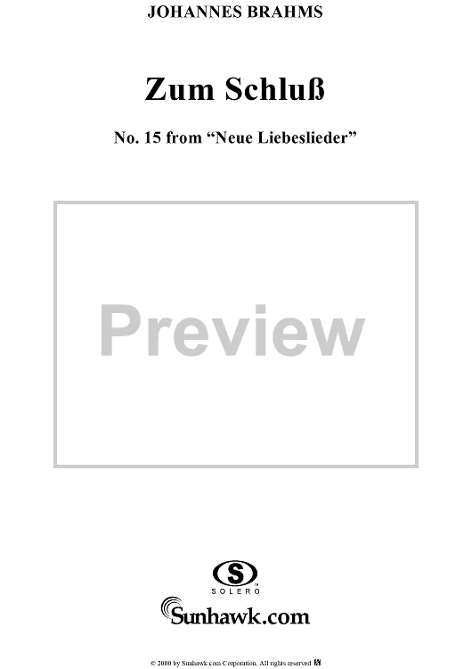 Digital Sheet Music for Neue Liebeslieder Walzes, Op. 65, No. 15 ("Zum Schluss") by Johann Wolfgang von Goethe, Johannes Brahms scored for 4-part Mixed Chorus/Piano, 4 Hands; id:241317