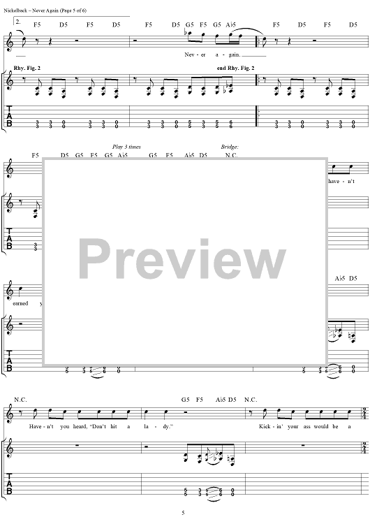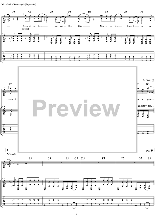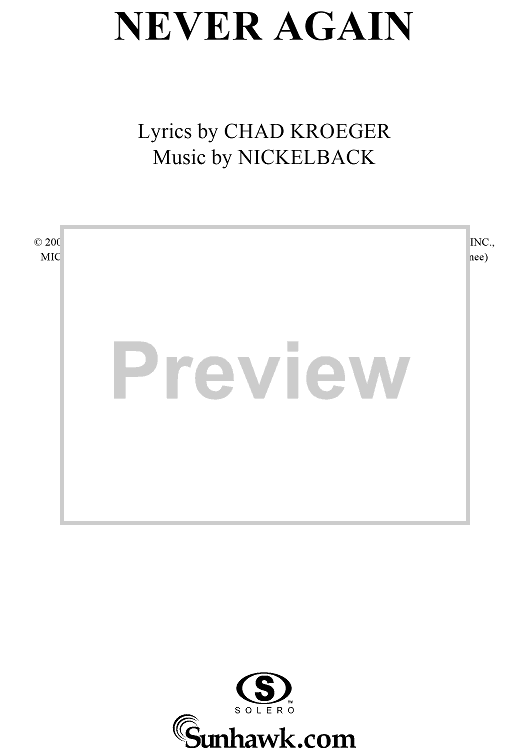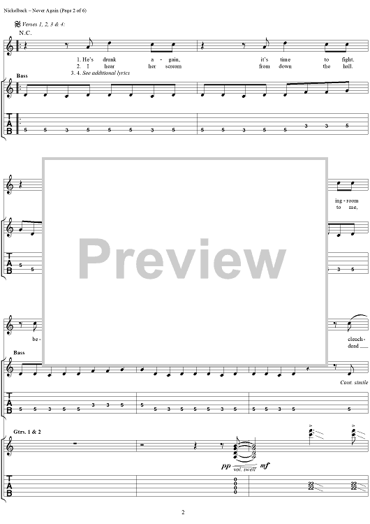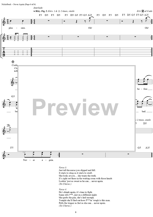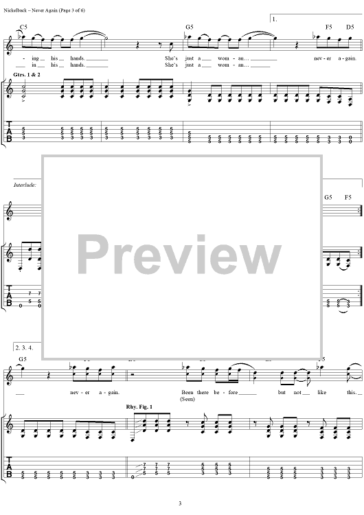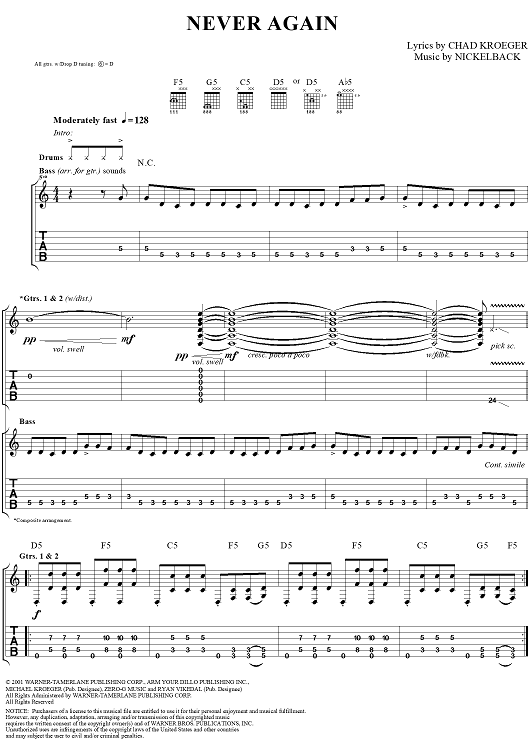 Digital Sheet Music for Never Again by Nickelback, Chad Kroeger scored for Guitar Tab/Vocal; id:287808