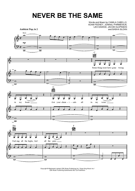 Digital Sheet Music for Never Be The Same by Jonnali Parmenius, Camila Cabello, Adam Feeney, Leo Dawod, Jacob Olofsson, Sasha Sloan scored for Piano/Vocal/Chords; id:465892