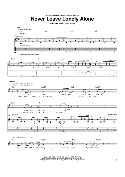 Digital Sheet Music for Never Leave Lonely Alone by Ben Harper scored for Guitar Tab; id:390086