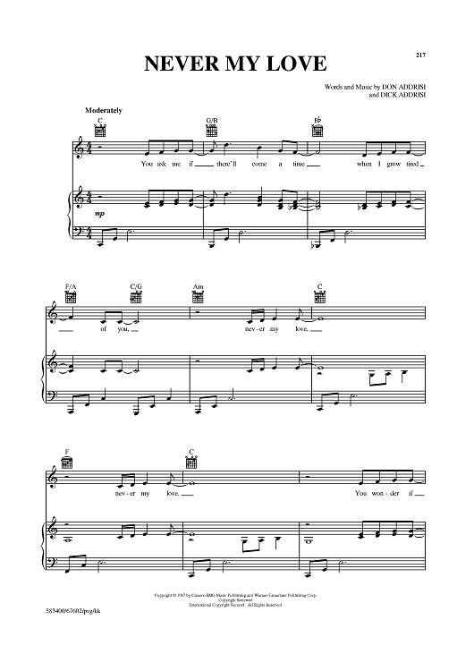Digital Sheet Music for Never My Love by Don Addrisi, Dick Addrisi, The 5th Dimension, The Association, Blue Swede scored for Piano/Vocal/Chords; id:388493