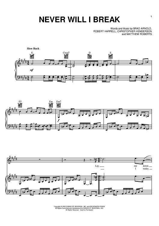 Digital Sheet Music for Never Will I Break by 3 Doors Down, Matt Roberts, Brad Arnold, Todd Harrell, Chris Henderson scored for Piano/Vocal/Chords; id:385105