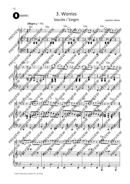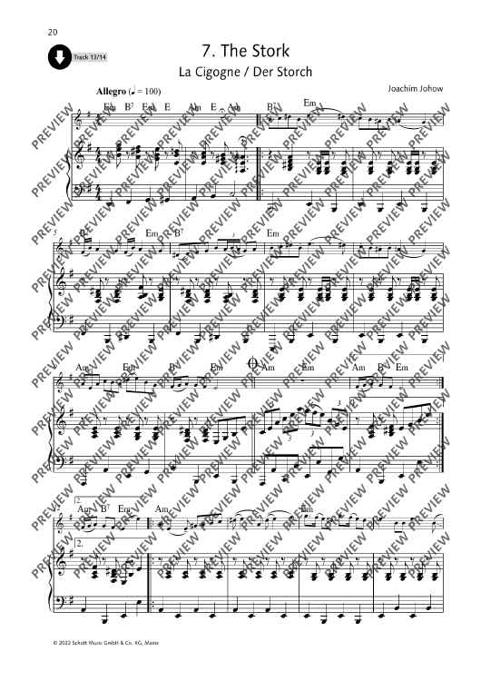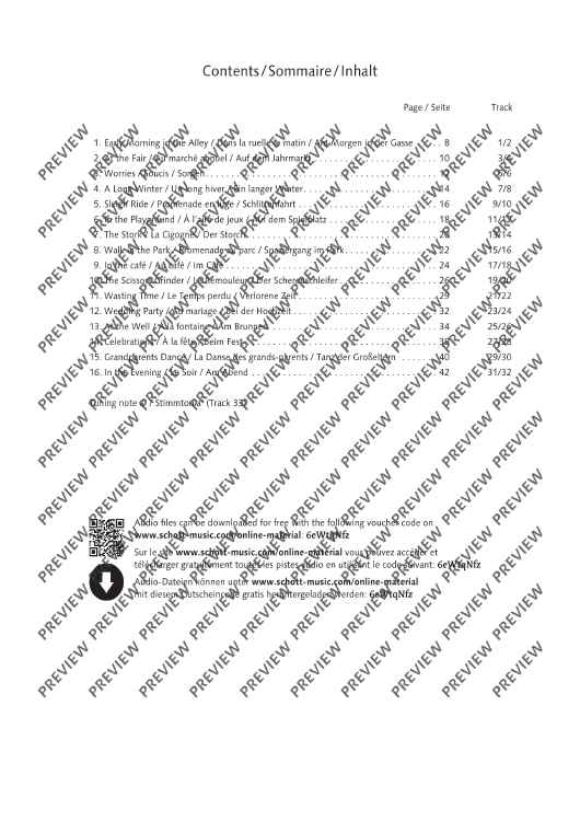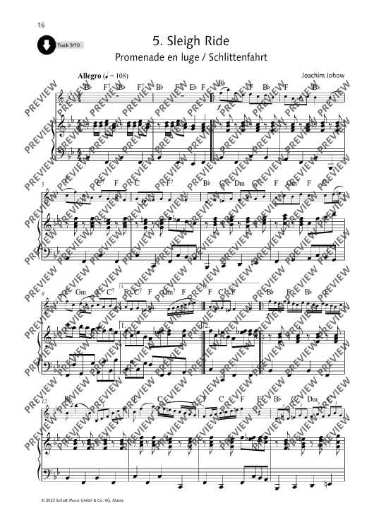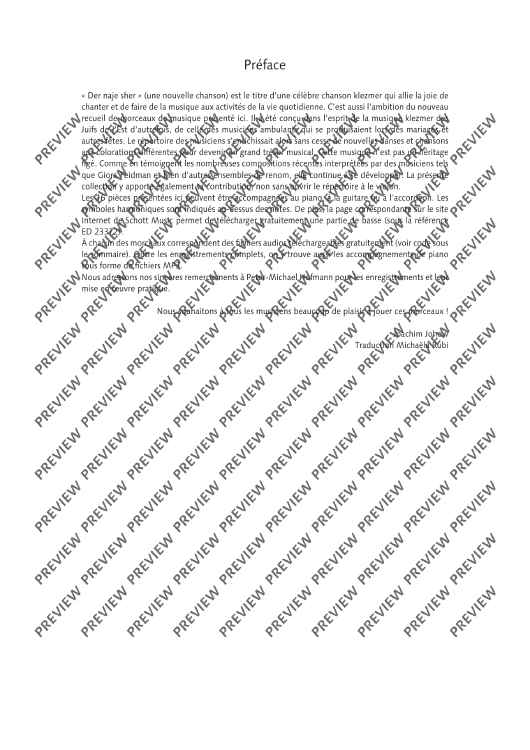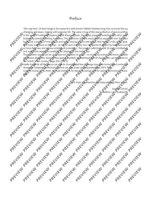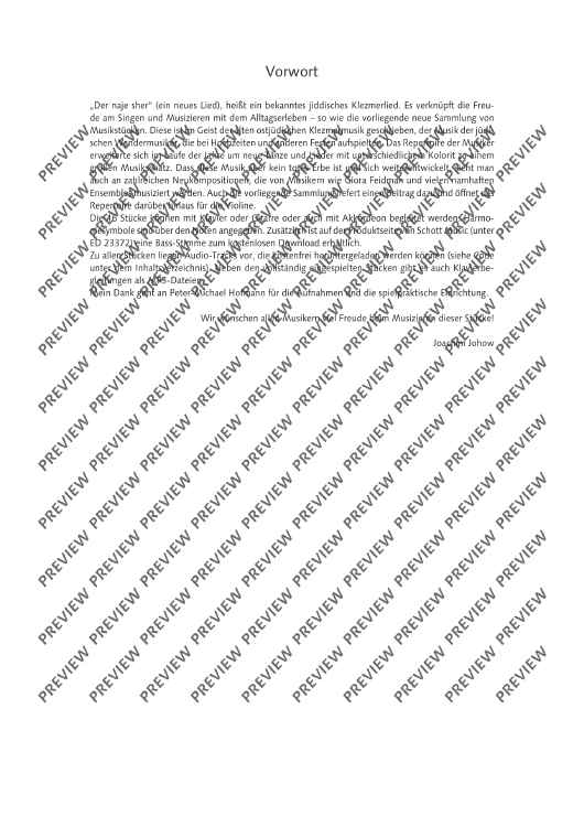Rousing klezmer pieces newly composed! Inspired by old klezmer melodies, Joachim Johow has written 16 new tunes for violon, reenacting scenes from life in a Jewish town, such as 'Am Morgen in der Gasse' [On the Street in the Morning], 'Auf dem Jahrmarkt' [At the Fair], 'Schlittenfahrt' [Sleigh Ride], 'Tanz der Großeltern' [Dance of the Grandparents], 'Am Abend' [In the Evening]. With notated piano accompaniment and additional harmonic symbols as well as an additional bass part (for download) which allow for a variety of instrumentations. The audio MP3 pack contains both full and playback versions.