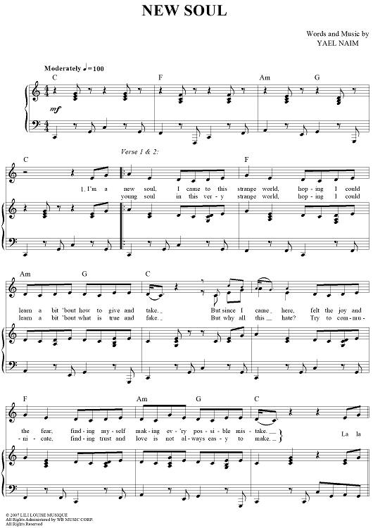 Digital Sheet Music for New Soul by Yael Naim scored for Piano/Vocal/Chords; id:430686