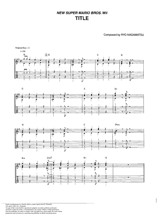 Digital Sheet Music for New Super Mario Bros. Wii: Title by Satoshi Aikawa, Ryo Nagamatsu scored for Guitar Tab; id:444089