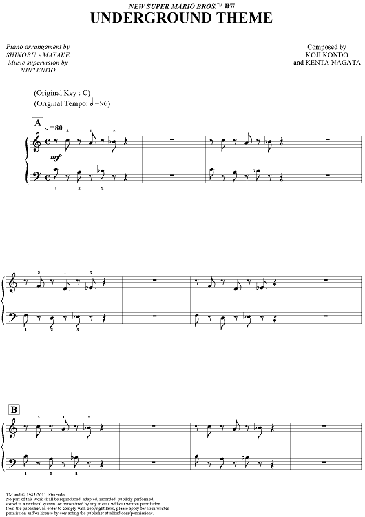 Digital Sheet Music for New Super Mario Bros. Wii™: Underground Theme by Koji Kondo, Kenta Nagata, Shinobu Amayake scored for Easy Piano; id:448398