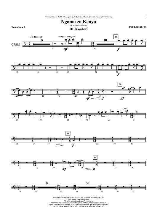 Digital Sheet Music for Ngoma za Kenya, Mvt III - Kwaheri - Trombone 1 by Paul Basler scored for Concert Band; id:405920