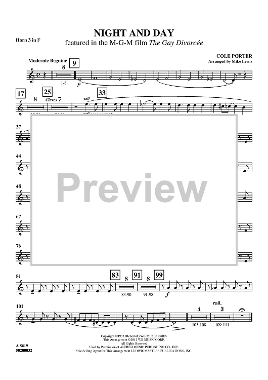Digital Sheet Music for Night and Day - Featured in the M-G-M film The Gay Divorcée - Horn 3 in F by Mike Lewis, Cole Porter scored for Full Orchestra; id:458802