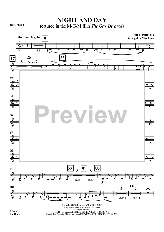 Digital Sheet Music for Night and Day - Featured in the M-G-M film The Gay Divorcée - Horn 4 in F by Mike Lewis, Cole Porter scored for Full Orchestra; id:458803
