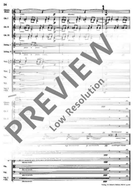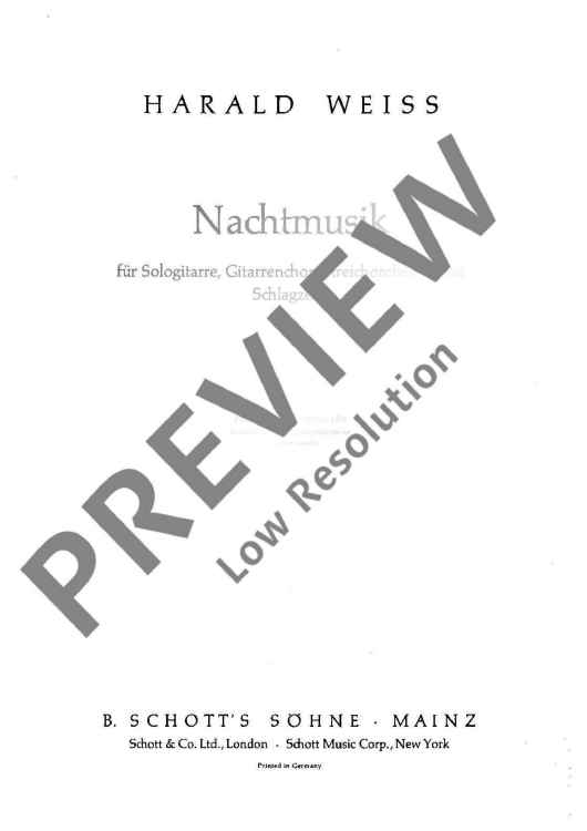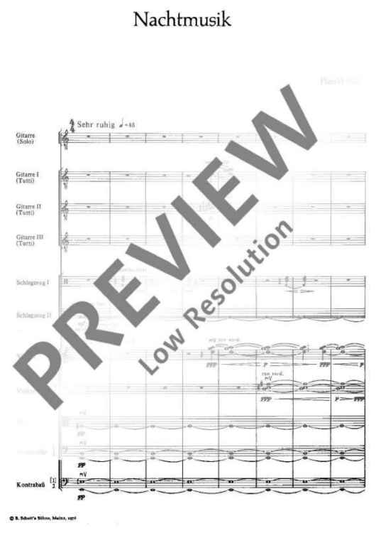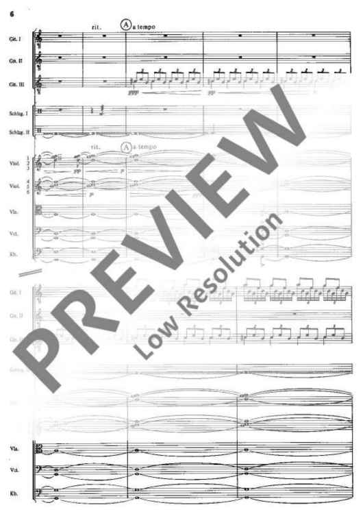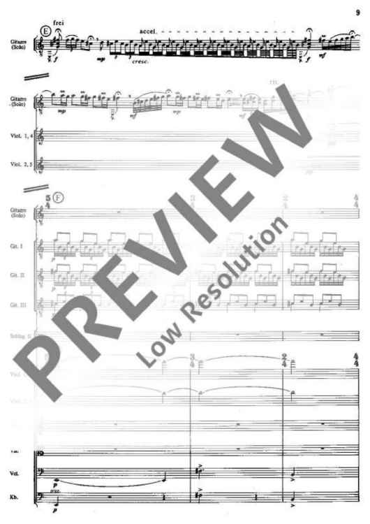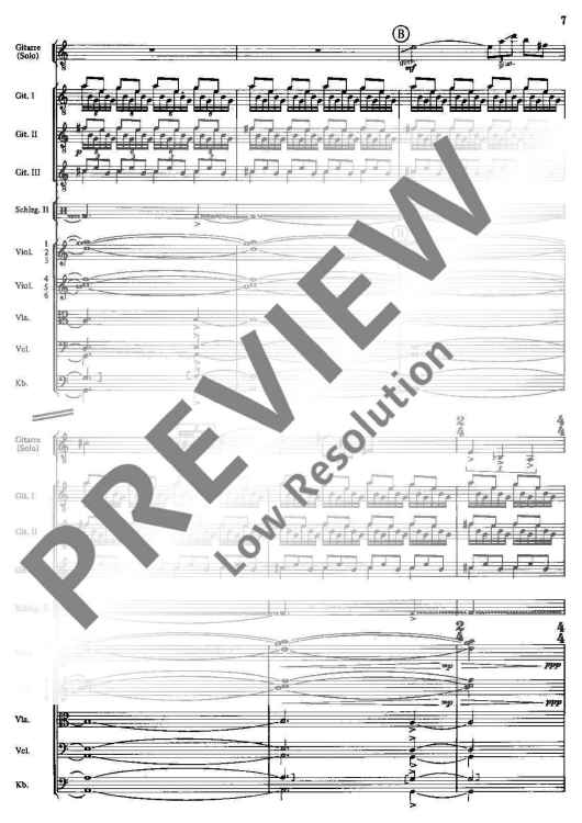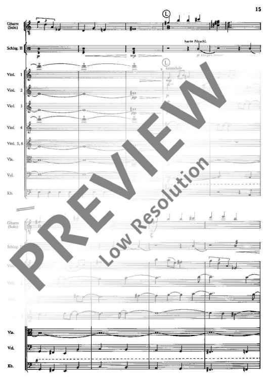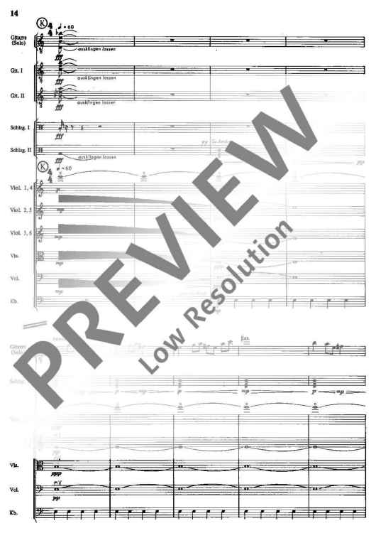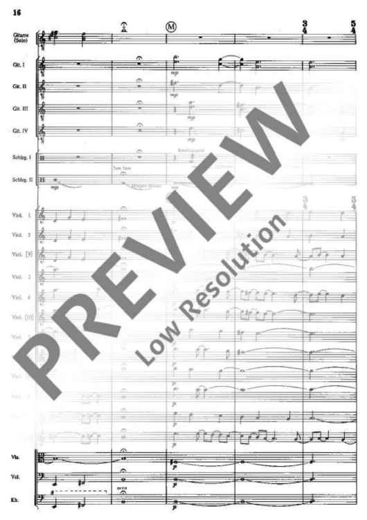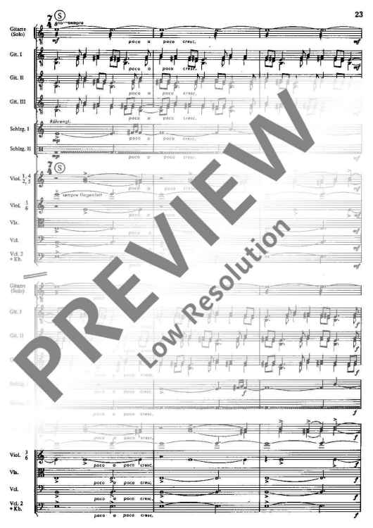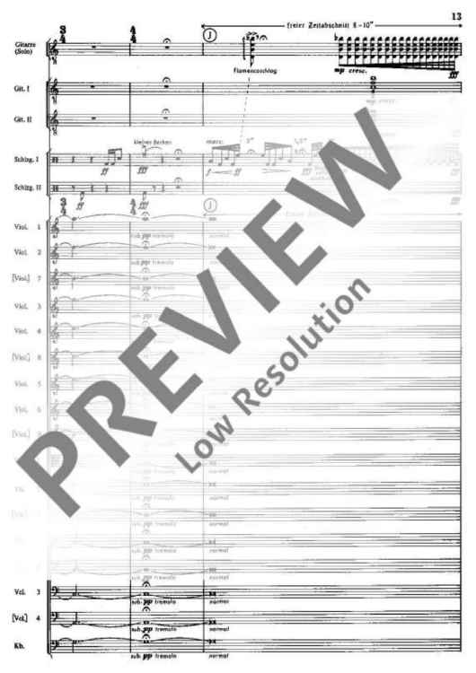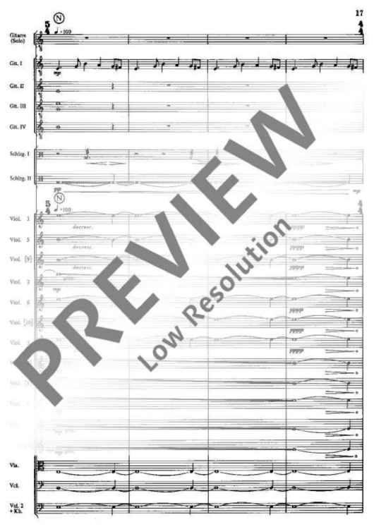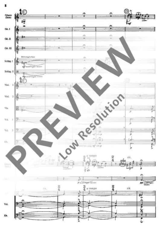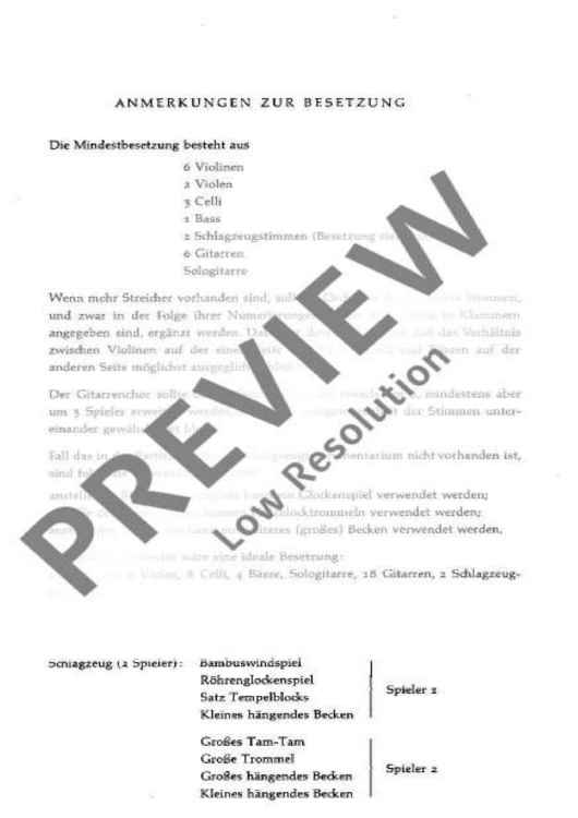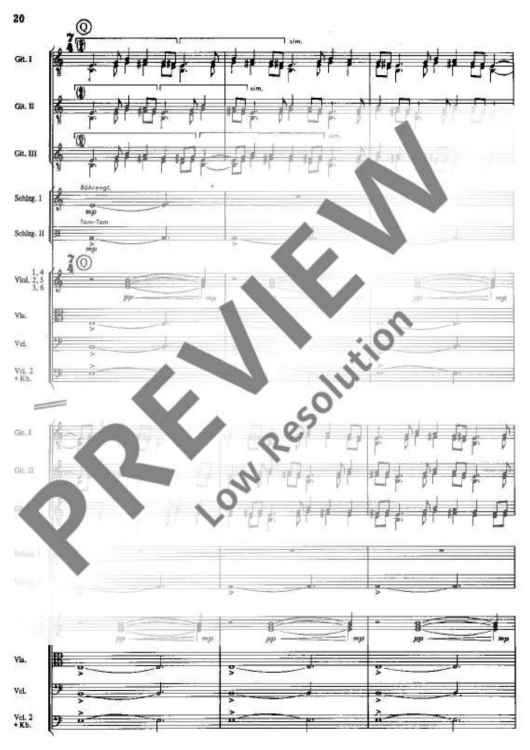 A modern instrumental piece with technically easy playing processes and a distinctive instrumentation. Strings are mostly divided, their number and range can be extended as one likes, the same applies to the guitar ensemble. Alternative instruments are indicated for the two percussionists. An attraction for young guitar and string ensembles.