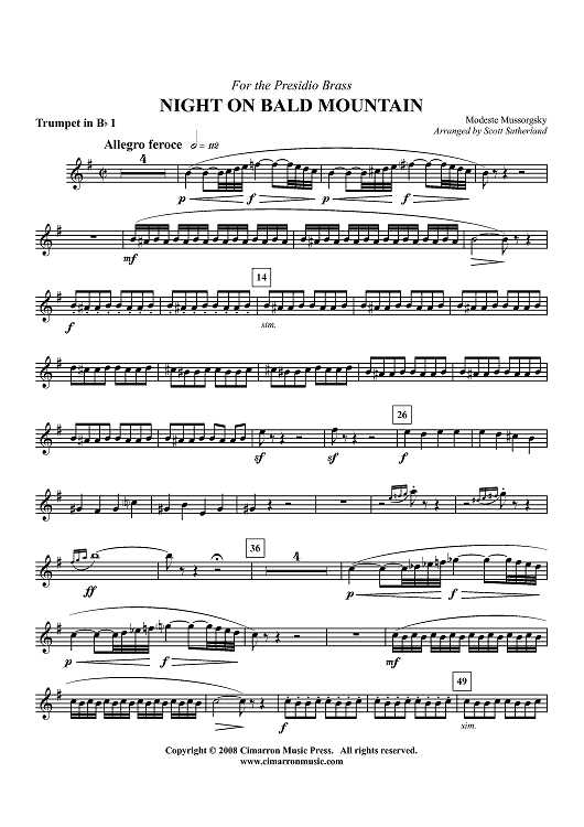 Digital Sheet Music for Night on Bald Mountain - Trumpet 1 in Bb by Modest Mussorgsky, Scott Sutherland scored for Brass Quintet; id:415983