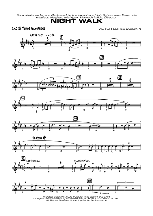 Digital Sheet Music for Night Walk - B-flat Tenor Saxophone 2 by Victor Lopez scored for Jazz Ensemble; id:319368
