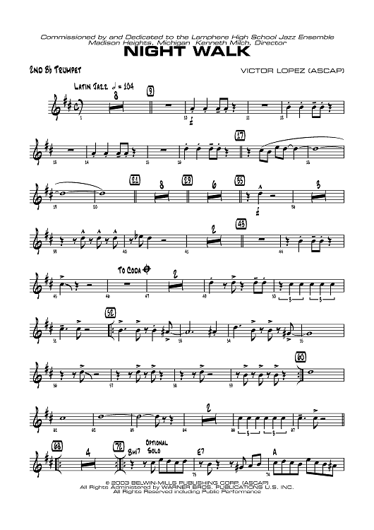 Digital Sheet Music for Night Walk - B-flat Trumpet 2 by Victor Lopez scored for Jazz Ensemble; id:319371