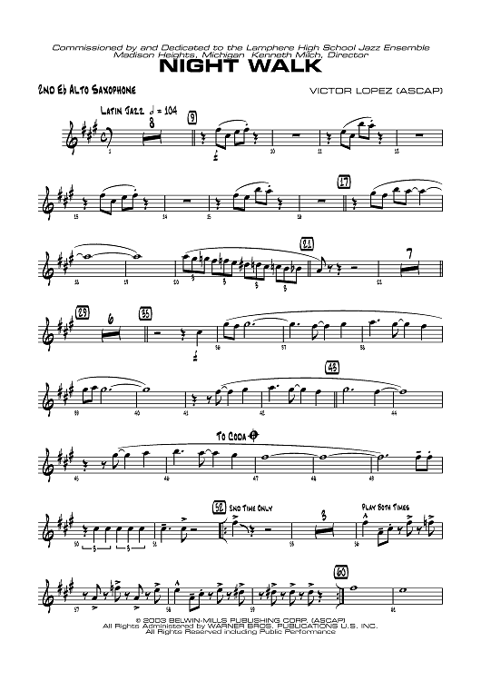 Digital Sheet Music for Night Walk - E-flat Alto Saxophone 2 by Victor Lopez scored for Jazz Ensemble; id:319366