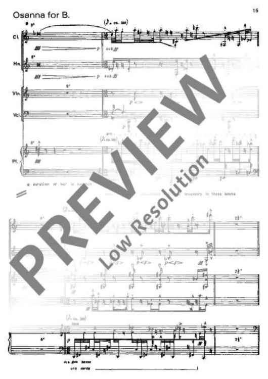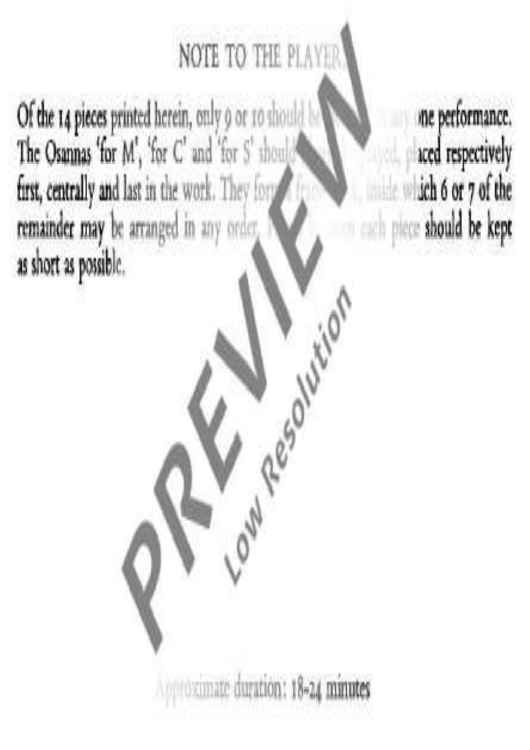 Of the 14 pieces printed herein, only 9 or 10 should be included in any one performance. The Osannas 'for M', 'for C' and 'for S' should always be played, placed respectively first, centrally and last in the work. They form a framework, inside which 6 or 7 of the remainder may be arranged in any order. Pauses between each piece should be kept as short as possible.