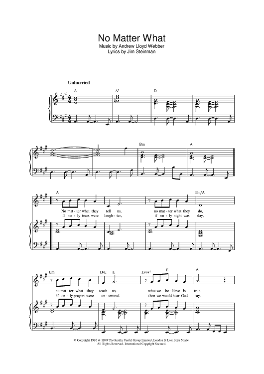 Digital Sheet Music for No Matter What by Andrew Lloyd Webber, Jim Steinman, Boyzone, Anne Godwin scored for Piano/Vocal/Chords; id:379062
