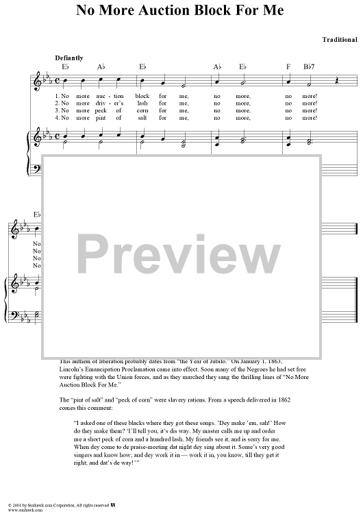 Digital Sheet Music for No More Auction Block For Me by Traditional scored for Piano/Vocal/Chords; id:260413