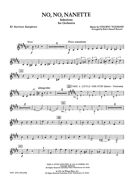 Digital Sheet Music for No, No, Nannette - Selections for Orchestra - Baritone Sax by , Vincent Youmans, Robert Russell Bennett scored for Orchestra; id:423749