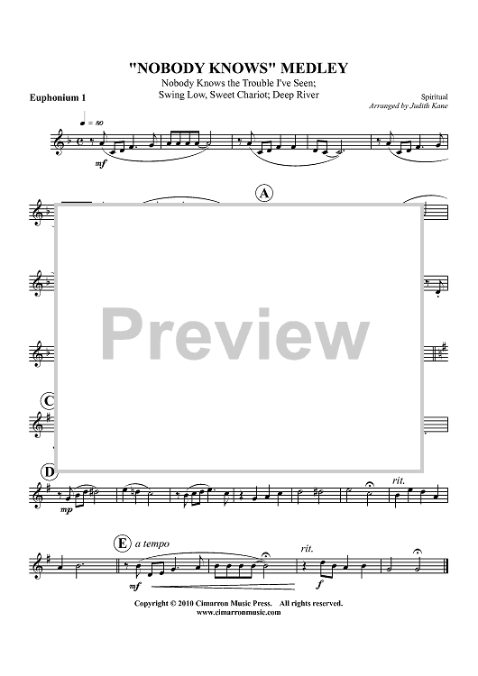 Digital Sheet Music for “Nobody Knows” Medley - Euphonium 1 by Spiritual, Judith Kane scored for Tuba Quartet; id:410031
