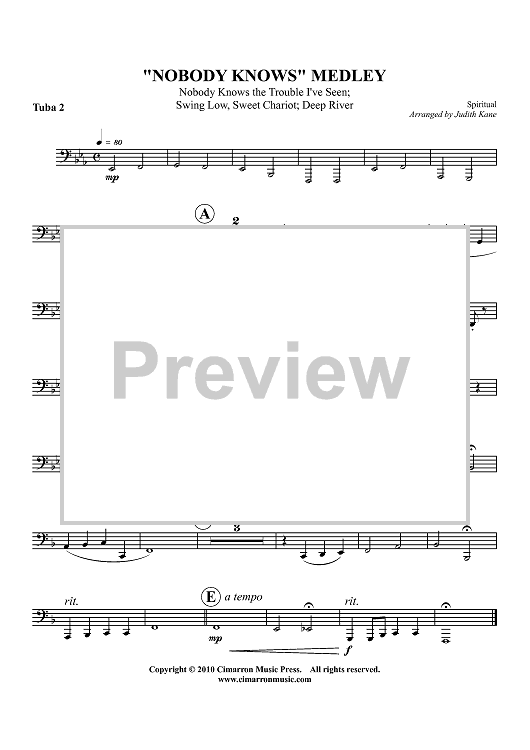 Digital Sheet Music for “Nobody Knows” Medley - Tuba 2 by Spiritual, Judith Kane scored for Tuba Quartet; id:410034